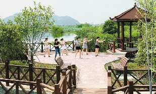 德清乾元镇联合村的村民在新建的中心公园跳舞健身。
