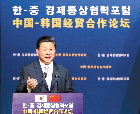 7月4日,国家主席习近平在首尔与韩国总统朴槿惠共同出席中韩经贸合作论坛。习近平发表题为《携手合作,共创未来》的重要讲话。 新华社记者 兰红光 摄