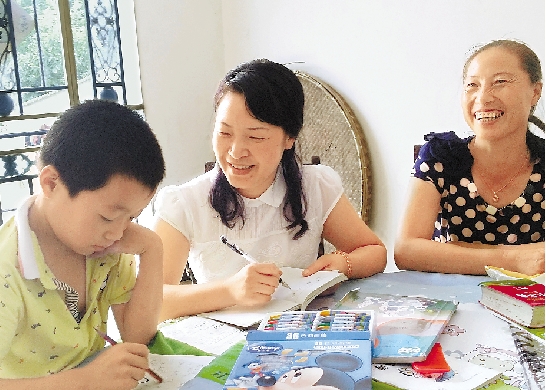 记者聂伟霞(中)为学生苏子健辅导暑假作业。 记者 俞佳友 摄