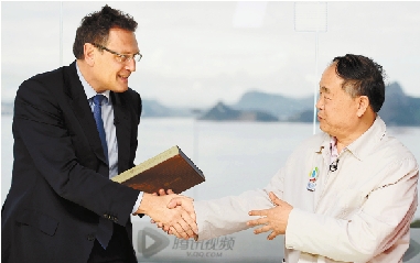 7月11日,作家莫言(右)在里约热内卢和国际足联秘书长瓦尔克会面,一起参加国内一家网站视频访谈节目的录制,在节目中共同聊足球。其间莫言向瓦尔克赠送了一本《孙子兵法》。据悉,莫言将到现场观看本届世界杯决赛。 新华社发