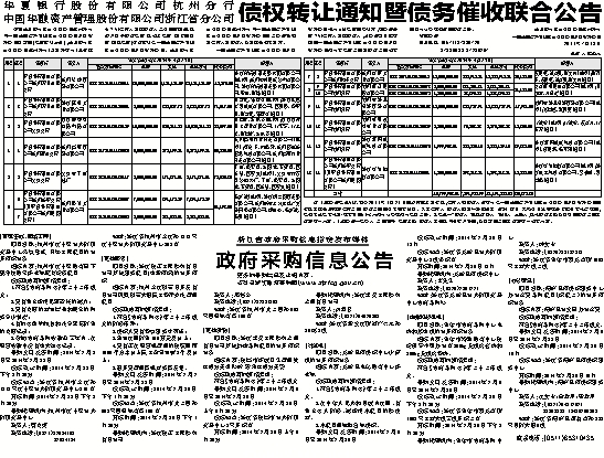 根据华夏银行股份有限公司杭州分行与中国华融资产管理股份有限公司浙江省分公司签署的《债权转让协议》,华夏银行股份有限公司杭州分行(含各分支行)已将其对下列借款人及其担保人享有的权利(包括但不限于担保债权、违约金债权、损失赔偿权、利息债权)依法转让给中国华融资产管理股份有限公司浙江省分公司。华夏银行股份有限公司杭州分行与中国华融资产管理股份有限公司浙江省分公司联合公告通知各借款人及担保人以及其他相关各方。