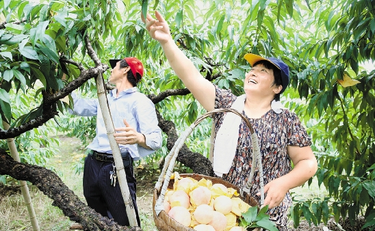 7月17日,在奉化市溪口镇新建村, 农户忙着采摘水蜜桃。奉化水蜜桃今年丰收,口感好,很受消费者欢迎。