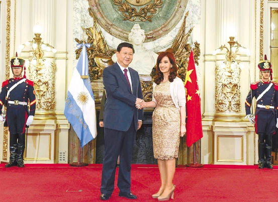 当地时间7月18日,国家主席习近平在布宜诺斯艾利斯同阿根廷总统克里斯蒂娜举行会谈。这是会谈开始前,克里斯蒂娜在总统府为习近平举行隆重欢迎仪式。 新华社记者 李学仁 摄