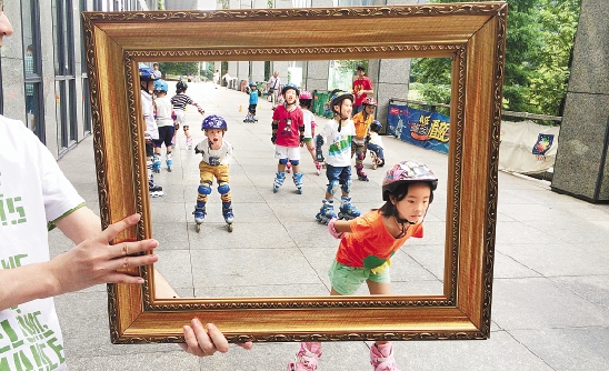 7月19日,在杭州市民中心,网友用取景框为一群玩轮滑的孩子取景,拍下有趣的瞬间。