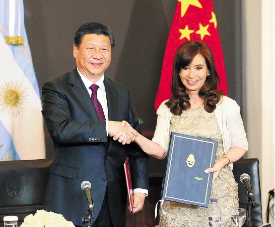 当地时间7月18日,国家主席习近平在布宜诺斯艾利斯同阿根廷总统克里斯蒂娜举行会谈。这是会谈后,两国元首共同签署并发表《中华人民共和国和阿根廷共和国关于建立全面战略伙伴关系的联合声明》。 新华社记者 刘卫兵 摄