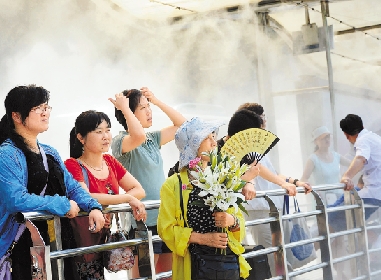 7月30日,杭州灵隐7路公交站台开启了“喷淋降温系统”,给候车的乘客送去一片清凉。 记者 吴元峰 摄