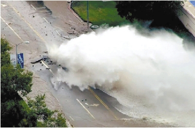 7月29日,在美国加利福尼亚州洛杉矶,日落大道上一根主水管发生爆裂后喷出水柱,导致附近加州大学洛杉矶分校校园部分路面积水,一些正在附近道路行驶的车辆被大水围困。