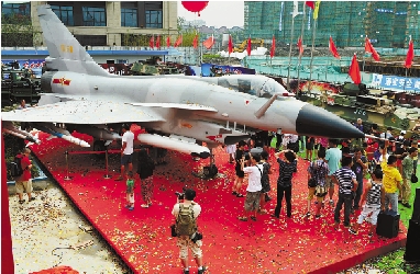 | 8月23日,首届上海国防兵器展在上海松江开幕,展览共展出歼10战斗机、63A式水陆坦克、水陆装甲车等装备和多款海陆空武器模型,让前来观展的市民、游客大饱眼福。图为当日参观者在观看歼10战斗机实物。 新华社发 龙巍 摄 |