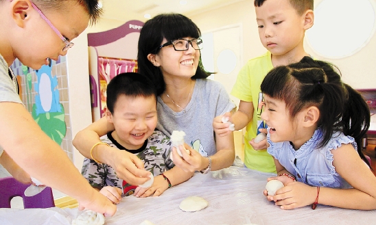 | 9月5日,德清开放教育幼儿园的老师在教孩子们如何制作月饼,并用嫦娥、白兔等生动的故事,告诉孩子们中秋节的由来。据了解,德清开放教育幼儿园是浙江日报报业集团旗下浙江开放教育集团的幼儿园,其软硬件均属一流,今年9月1日开园,目前已经开展教学活动。 宣言 摄 |