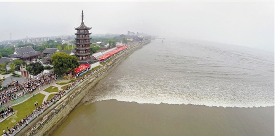 9月7日,海宁观潮节,各地游客纷纷前来一睹壮观天下的钱江大潮。图为9月7日10时34分一线大潮。 海宁日报记者 王超英 摄