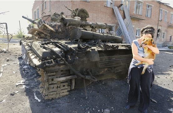 9月6日,在距乌克兰马里乌波尔东北22公里的一处村庄,一名怀抱小狗的妇女站在坦克残骸旁。 新华社发
