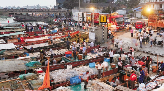9月7日傍晚,长兴县太湖街道新塘鱼港,市民从四面八方赶来抢购白鱼、白虾、梅鲚鱼等鱼鲜,为中秋团聚准备食材。 谭云俸 丁珊 摄