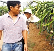 成泰农商行客户经理在金华市寨春农业开发有限公司新项目火龙果基地内,查看火龙果的生长情况。