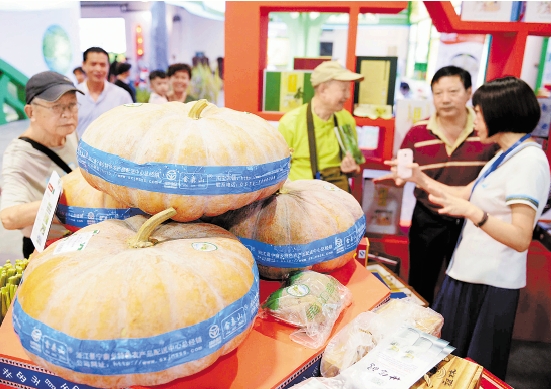 丽水生态精品农博会的优质农产品引来众多杭州市民抢购。图为市民被景宁畲乡特色农产品展台上的大南瓜吸引。