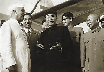 1954年6月,周恩来总理访问印度和缅甸期间,同印、缅两国总理共同倡导将和平共处五项原则作为处理国际关系的准则。图为周总理访印时在机场受到尼赫鲁总理的欢迎。