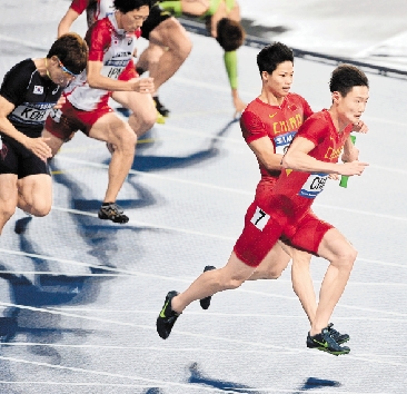 苏炳添(右二)与张培萌(右)在田径男子4X100米接力决赛中交接棒。 新华社发