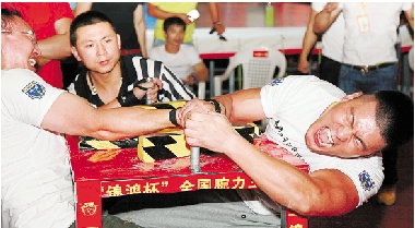 | 10月3日,2014“锦鸿杯”全国腕力王大赛在温岭对决,来自全国各地的200多名掰手劲高手争夺5个级别的“中国腕力王”称号。刘建廷、杨晔、徐卫健、赵子瑞和徐锦山分获68公斤、73公斤、79公斤、85公斤和86以上公斤级冠军,赵子瑞获“中国腕力王”总冠军。图为85公斤级第四名唐志明(右)在比赛中。 温岭日报记者 刘振清 摄 |