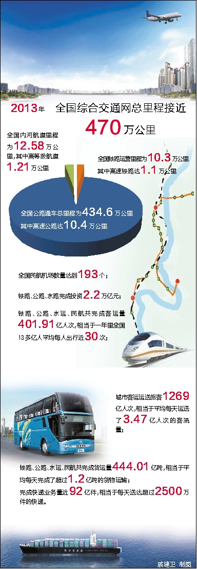 铁路、公路、水运、民航共完成客运量401.91亿人次,相当于一年里全国13多亿人平均每人出行近30次;