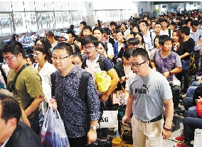 10月5日,杭州各个车站迎来了长途出游客人的返程高峰。铁路杭州站人流密集,候车室内熙熙攘攘。