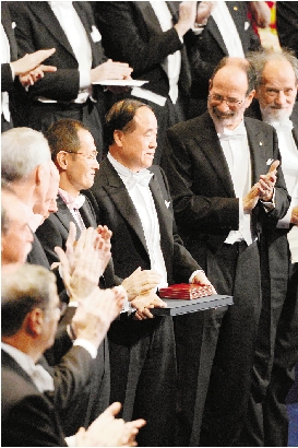 | 中国读者关注世界的同时,世界也在关注着腾飞的中国,图书成为一个重要渠道。中国作家的作品获得更多的国际认可。1999年,我国版权贸易逆差为15∶1。经过10多年的努力,到2012年,这一差距缩小至1.91∶1。我国对美、加、英、法、德5个西方传统发达国家输出图书版权总量增长近122倍,达到2213项,贸易逆差从1∶387缩小至1∶4。 图为2012年12月10日,瑞典斯德哥尔摩音乐厅,莫言获颁2012年诺贝尔文学奖。 |