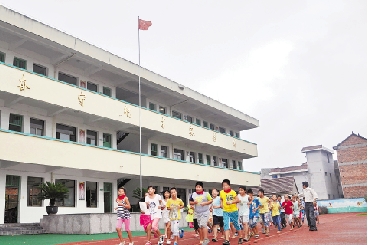 白沙中心小学的孩子们在国旗下奔跑。 王寅锋 摄
