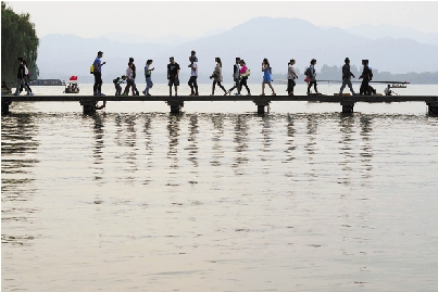 10月6日,西湖天气晴朗,游人穿行。 里尔 摄