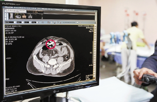 这是韩国医院方面10月10日公布的死亡的中国船长的CT扫描图,图像显示其左侧腹部有中弹的枪伤,体内还留有子弹残骸。 新华社发