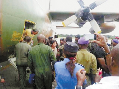 10月11日,在喀麦隆被绑架后安全获释的10名中国工人乘坐喀麦隆政府专机抵达首都雅温得。 新华社记者 黄亚男 摄