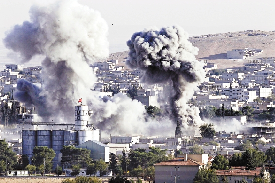 10月10日,在叙土边境重镇科巴尼,美军战机对“伊斯兰国”武装进行空中打击后浓烟升起。 新华社发