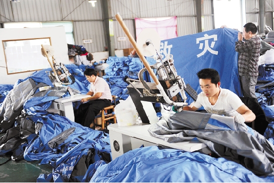 10月11日,临海亨达工艺制品公司工人们正在抓紧缝制救灾帐篷。云南景谷县地震发生后,作为民政部救灾帐篷定点生产企业,该企业连日赶制救灾帐篷,第一批1000顶帐篷将于12日傍晚前运抵灾区。