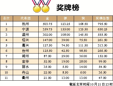 | 5 | 嘉兴 | 127.50 | 74.50 | 111.50 | 313.50 |