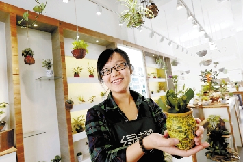 黎明92文创园创意盆景店的店员正在向顾客展示产品。