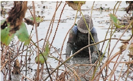 收藕季节,藕农要踩进没膝的泥泞里收藕,很是辛苦。
