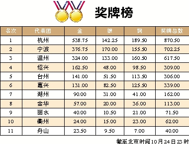 | 10 | 衢州 | 24.00 | 15.00 | 23.00 | 62.00 |
