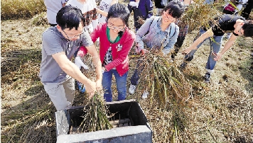 图为收稻谷现场,同学们踩着脱谷机,体会到农家的辛劳。