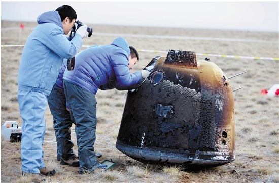中国探月工程三期再入返回飞行试验器的返回器成功在着陆区预定区域降落。 新华社记者 任军川 摄