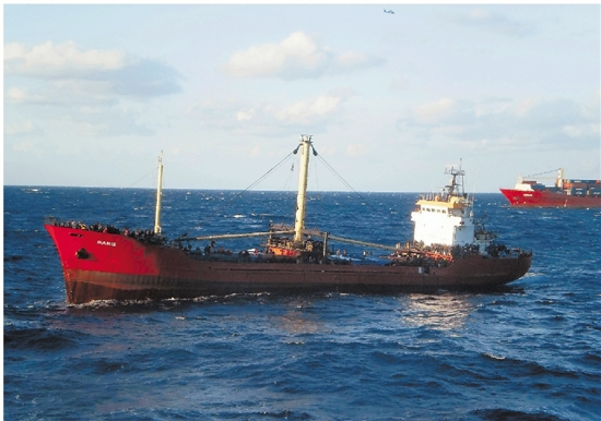 这张11月25日发布的照片显示,一艘运载约700名非法移民的货船在希腊克里特岛东南约30海里的海域漂流。 新华社发