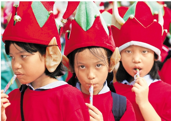 11月25日,孩子们头戴圣诞帽,身穿精灵服饰在泰国曼谷参加圣诞庆祝活动。当日,来自曼谷各学校及儿童福利机构的1762名儿童扮成圣诞老人的小精灵模样,打破了同时同地聚集圣诞老人小精灵人数最多的吉尼斯世界纪录。 新华社发