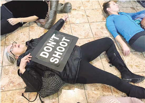 11月28日,在美国密苏里州布伦特伍德,示威者躺在加列里亚购物中心内抗议。 新华社发