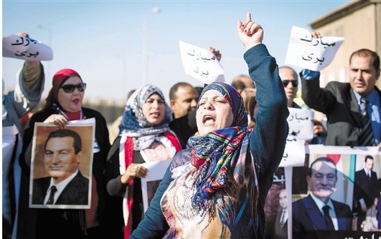11月29日,埃及首都开罗,穆巴拉克的支持者在庭审现场外声援。