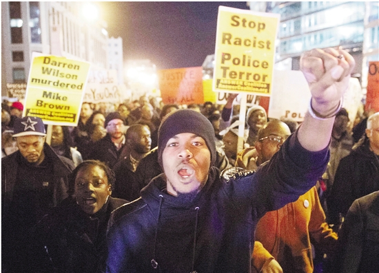11月25日,示威者在美国华盛顿街头呼喊口号,抗议弗格森事件中大陪审团做出的不起诉涉事警察的决定。