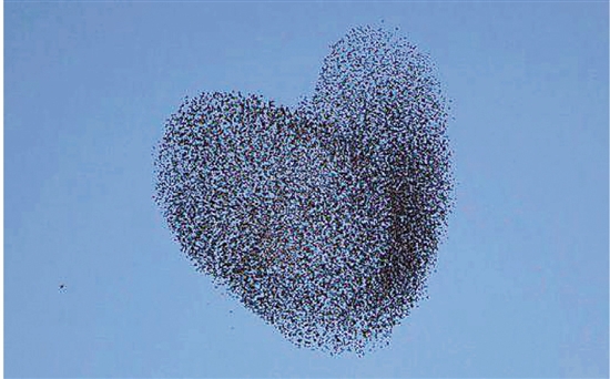 2月12日,就在西方情人节的前夕,以色列东南部一个鸟群在迁徙时拼成了心形图案。 视野网供图