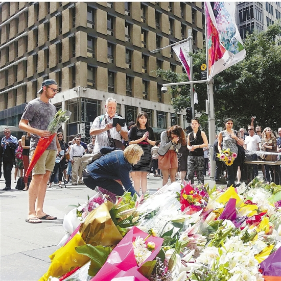 12月16日,在澳大利亚悉尼,人们在发生人质劫持事件的咖啡店前献花,悼念遇难者。 新华社记者 金林鹏 摄