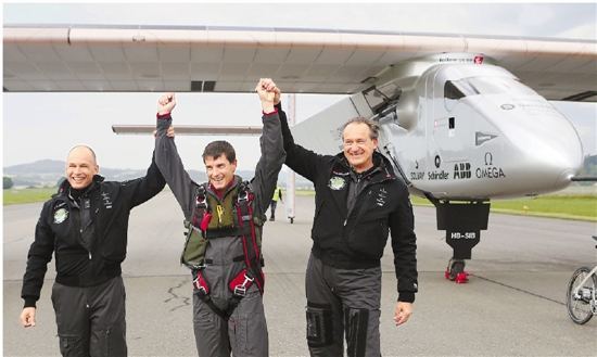 在瑞士帕耶讷,驾驶“太阳驱动”2号太阳能飞机完成首飞的飞行员马库斯·舍德尔(中)、项目发起人安德烈·博尔施贝格(右)和贝特兰德·皮卡德在飞机落地后合影。