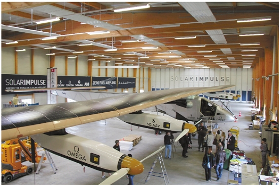 停在瑞士西部帕耶讷空军基地的“太阳驱动”2号太阳能飞机。