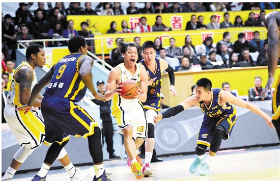 | 在21日晚的CBA联赛第33轮比赛中,浙江广厦男篮主场迎战领头羊辽宁队,结果以120比113获胜,如愿保住前八的排位。另外一场比赛,浙江稠州银行男篮同样在主场,历经加时,以121比116战胜天津队。图为广厦队林志杰(中)在比赛中持球进攻。 记者 潘良干 摄 |