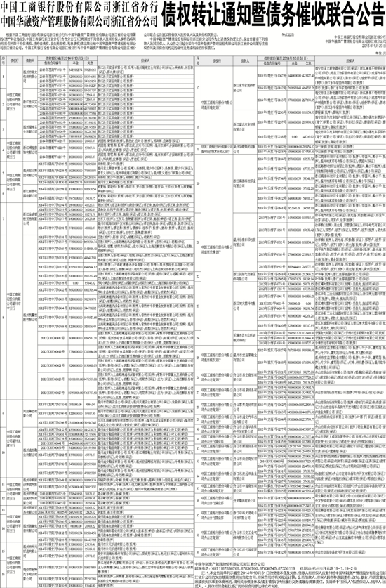 根据中国工商银行股份有限公司浙江省分行与中国华融资产管理股份有限公司浙江省分公司签署的《资产转让协议》,中国工商银行浙江省分行(含各分支行)已将其对下列借款人及其担保人享有的权利(包括但不限于担保债权、违约金债权、损失赔偿权、利息债权)依法转让给中国华融资产管理股份有限公司浙江省分公司。中国工商银行股份有限公司浙江省分行与中国华融资产管理股份有限公司浙江省分公司联合公告通知各借款人及担保人以及其他相关各方。