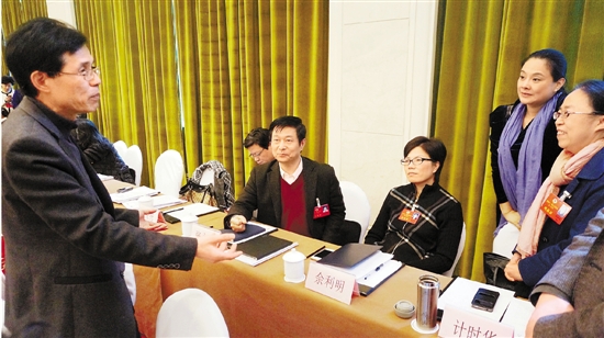 1月22日,在省政协十一届三次会议的联组讨论上,政协委员就关注的热点问题展开热烈讨论。就连5分钟的会议间歇,许多委员仍在热议医疗保障问题。 本报记者 吴煌 摄