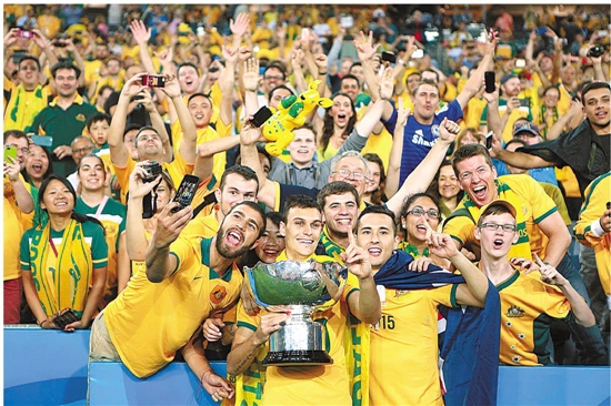 1月31日,在悉尼澳大利亚体育场进行的亚洲杯足球赛决赛中,东道主澳大利亚队在90分钟内与韩国队战成1比1平。经过加时赛,澳大利亚队凭借特洛伊西的进球最终以2比1取得胜利,首度夺得亚洲杯,成为第八支夺得亚洲杯的球队。 新华社发 |