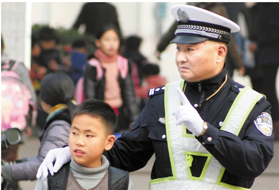 "最美交警"张进生前护送学生过马路的资料图片。